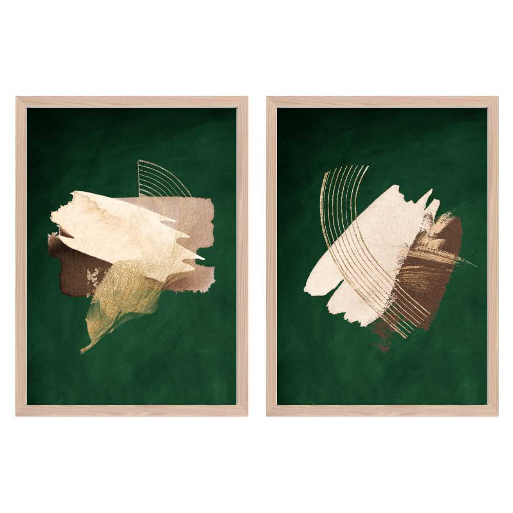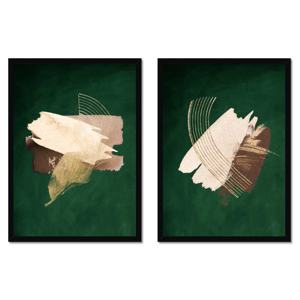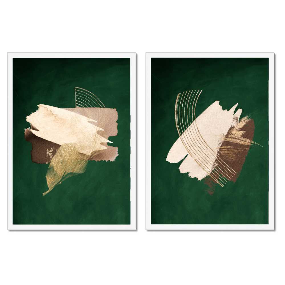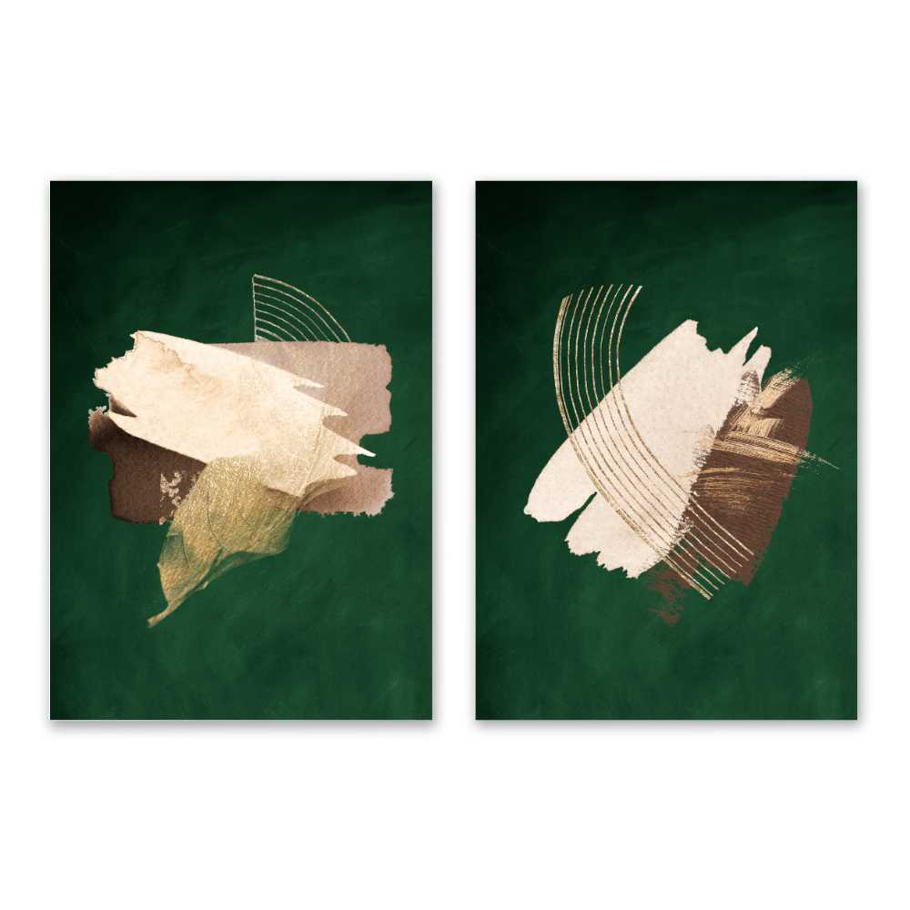 Discover a luxurious fusion of earthy tones and lush vibrancy with our set of 2 abstract wall art prints. This exquisite duo combines the organic warmth of beige, gold, and brown with the rich depth of an emerald green background, creating a sophisticated and captivating visual experience. Perfect for those who appreciate the melding of natural hues and opulent design in their decor.