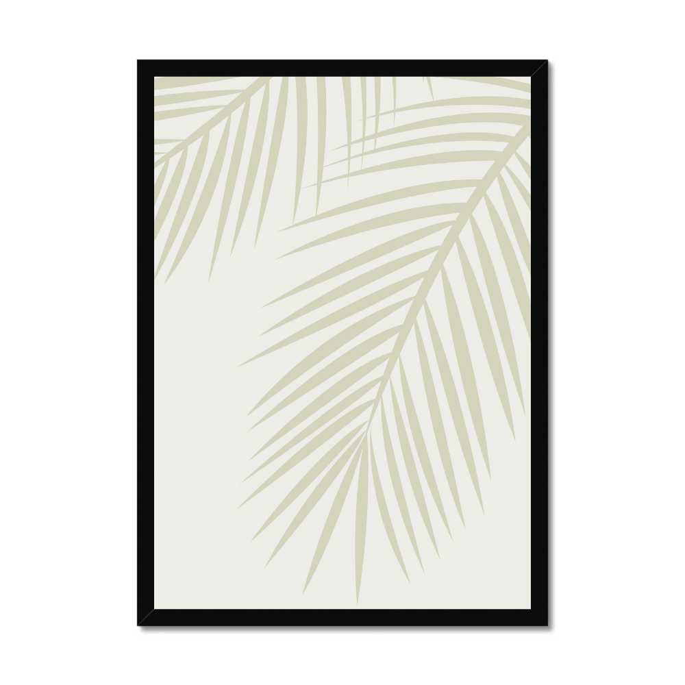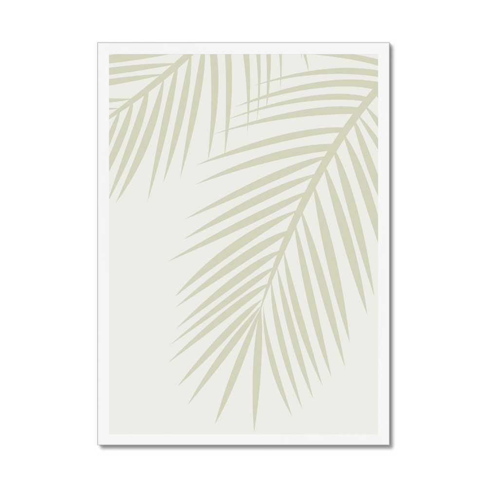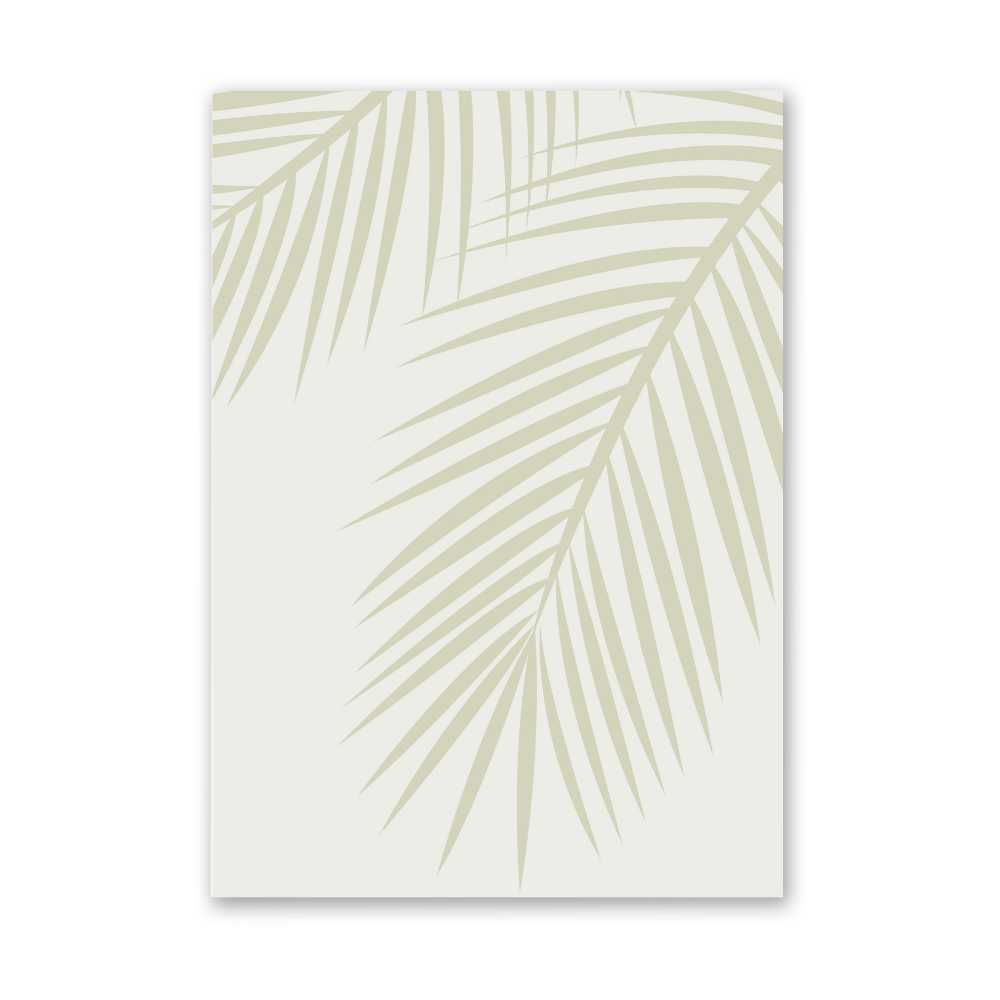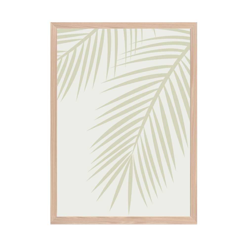 At the heart of this piece lies the graceful silhouette of palm leaves, depicted in a olive green hue. This color choice is reminiscent of the natural shades found in lush tropical foliage, evoking a sense of peacefulness and vitality. The silhouette design highlights the intricate patterns and delicate structures of the palm leaves, from their long, slender fronds to the gentle curves of their edges.