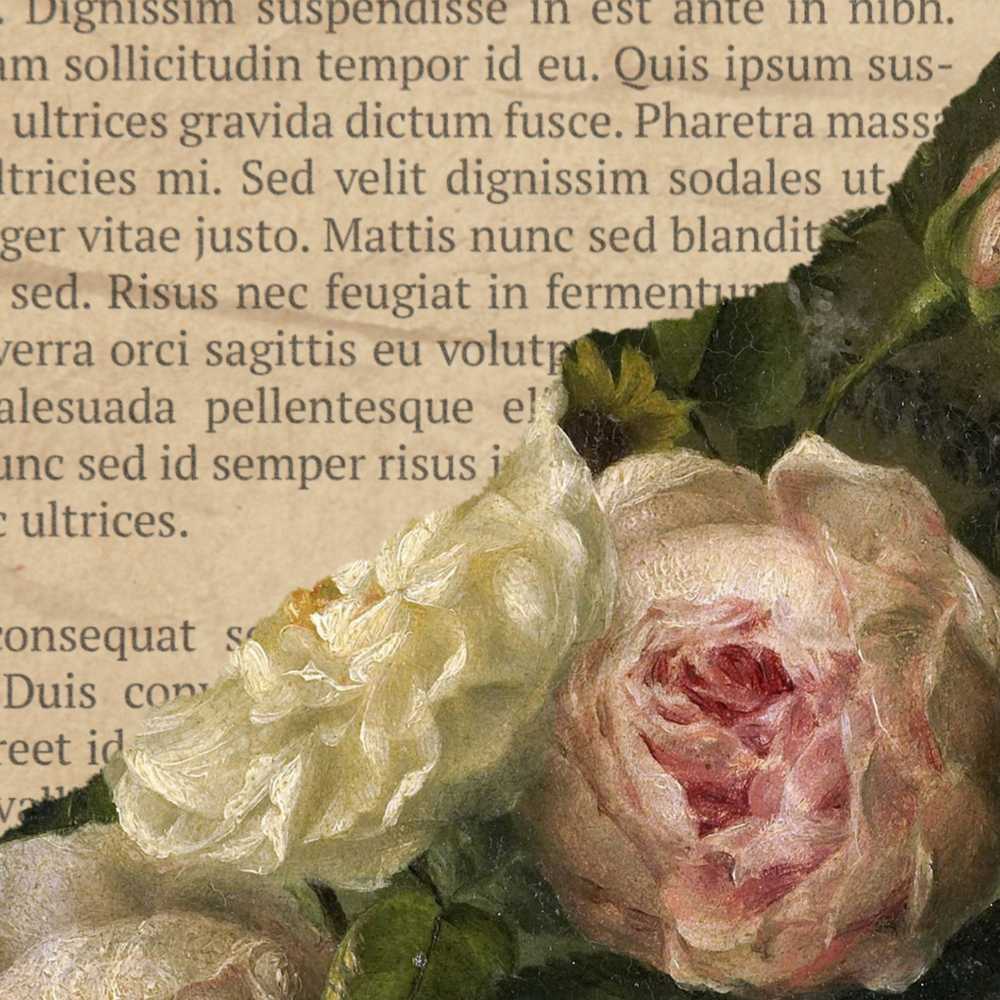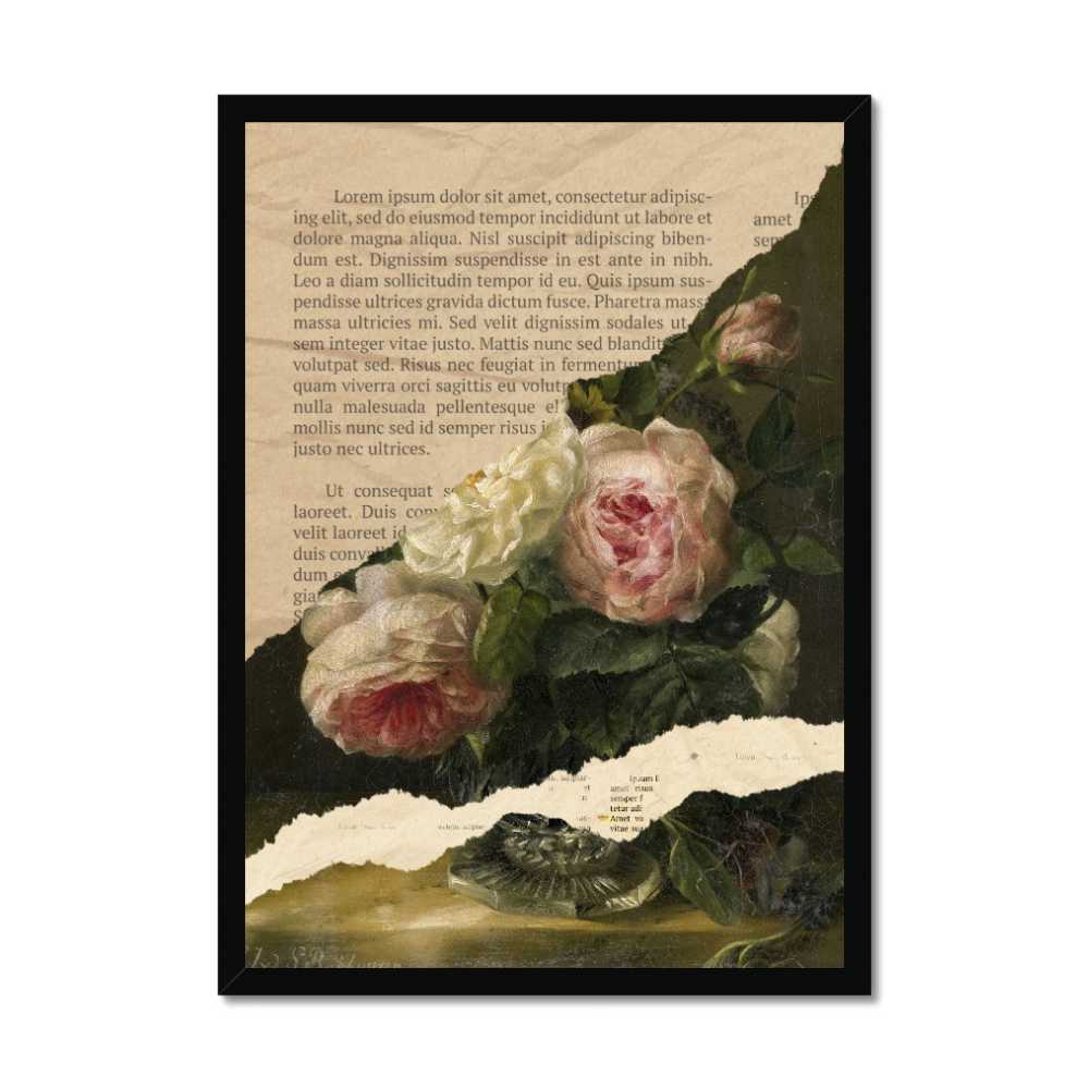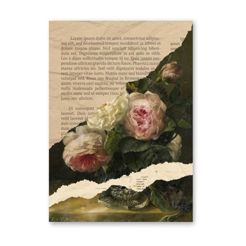 A unique wall art print that combines the textual allure of book page art with the timeless beauty of an old still life painting.