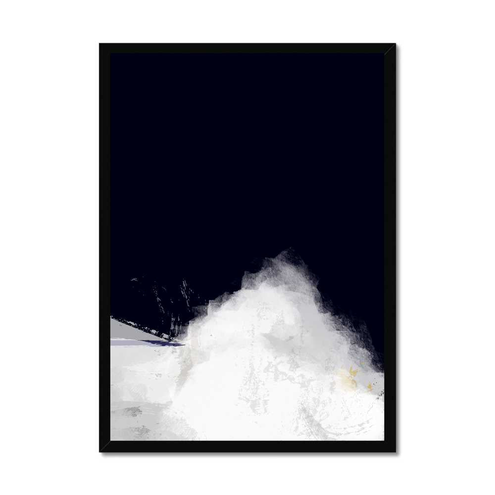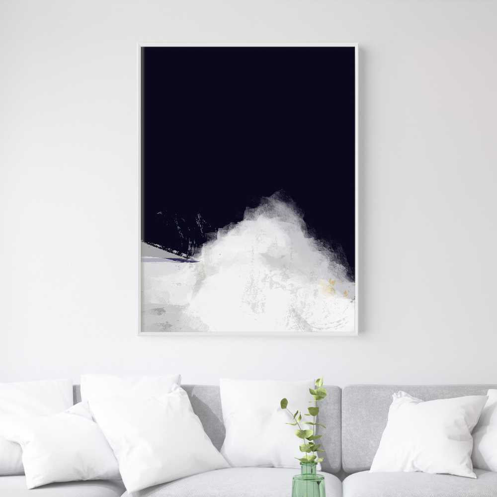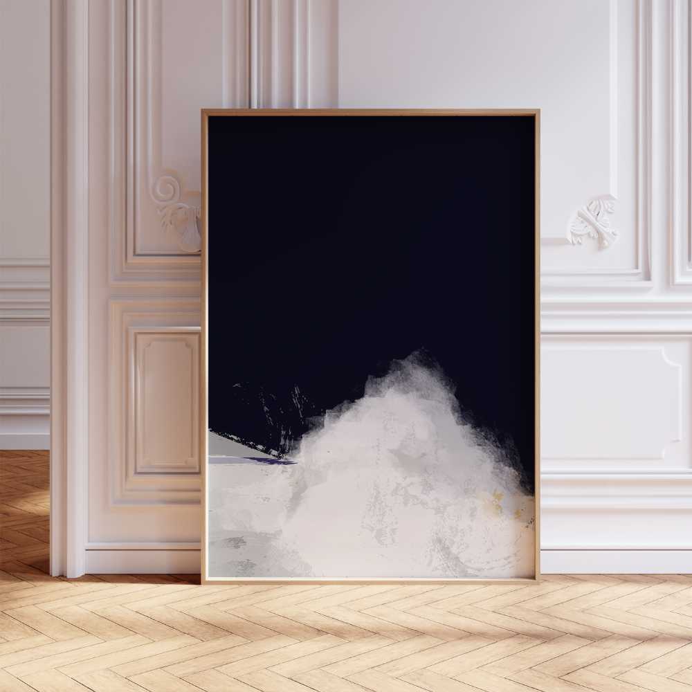 "Summit" is an evocative piece of wall art that distills the awe-inspiring beauty of a mountain's peak into a compelling abstract form. Set against a deep navy blue background, the stark white of the mountain top emerges, creating a striking visual contrast that captures the essence of solitude and achievement found at the highest points on earth. This artwork is a tribute to the untamed spirit of the mountains, reimagined through the lens of modern abstract art.