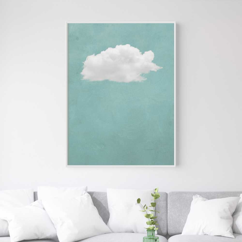 A contemplative piece of wall art that captures the singular beauty of a lone cloud adrift in an expansive mint green background, emphasizing the tranquil and often overlooked moments of nature. Ideal for any space in need of a visual escape or a moment of Zen. Its minimalist aesthetic makes it highly versatile, suitable for modern, contemporary, and even traditional decors.