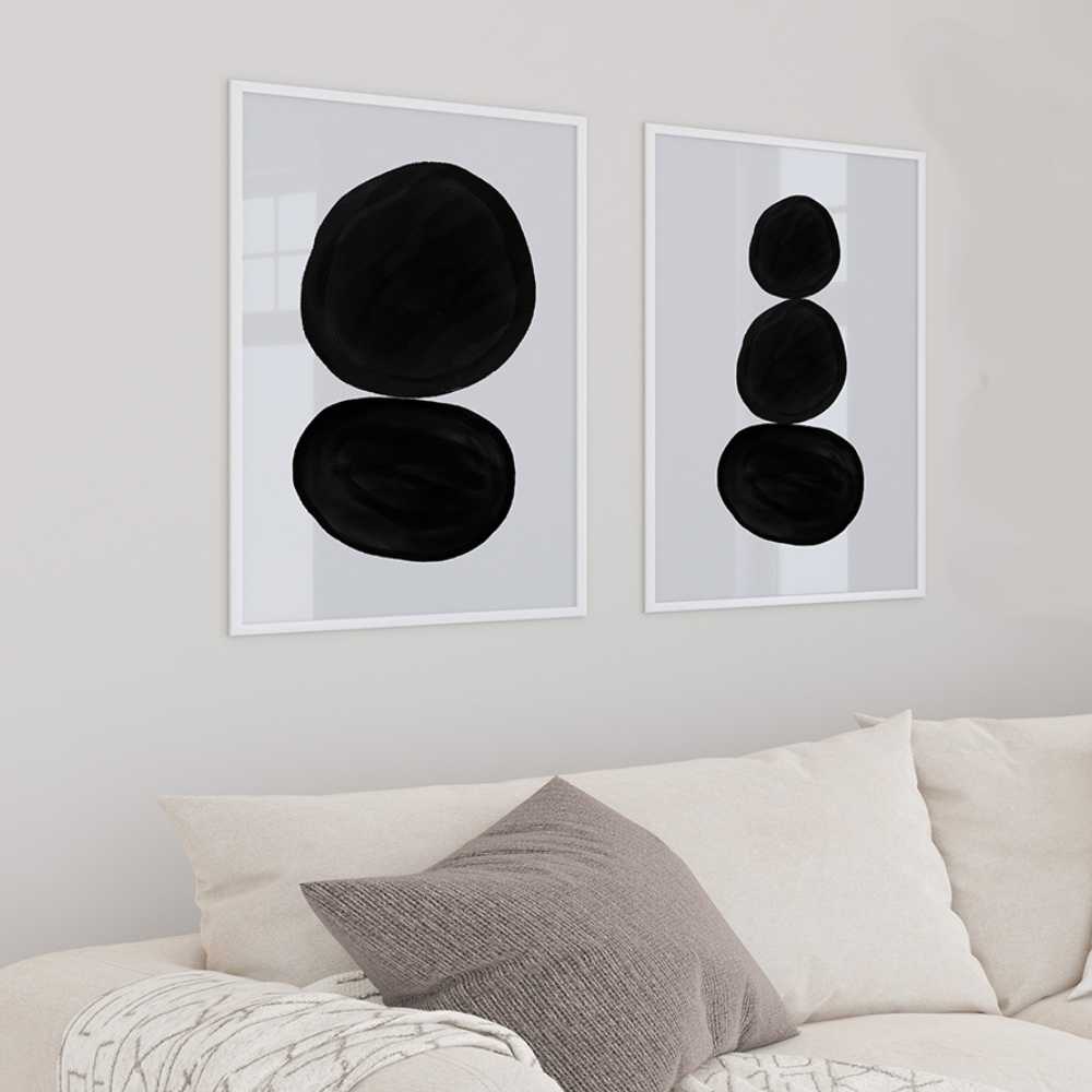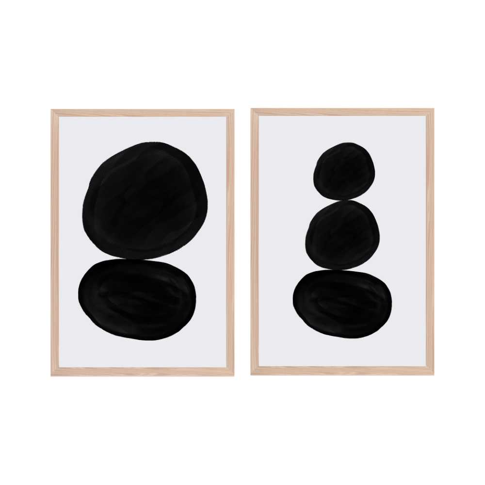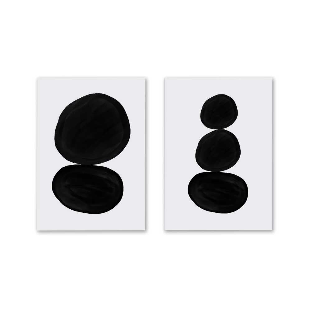 Each print in this minimalist set features a different arrangement of black Zen stones, known for their use in the ancient practice of stone stacking. These stones, with their smooth, rounded surfaces and deep black hues, evoke a sense of harmony and balance.