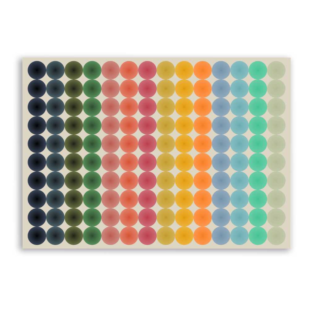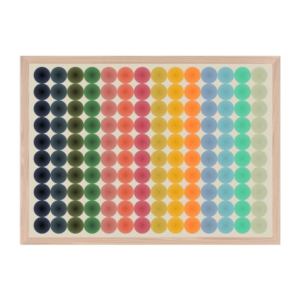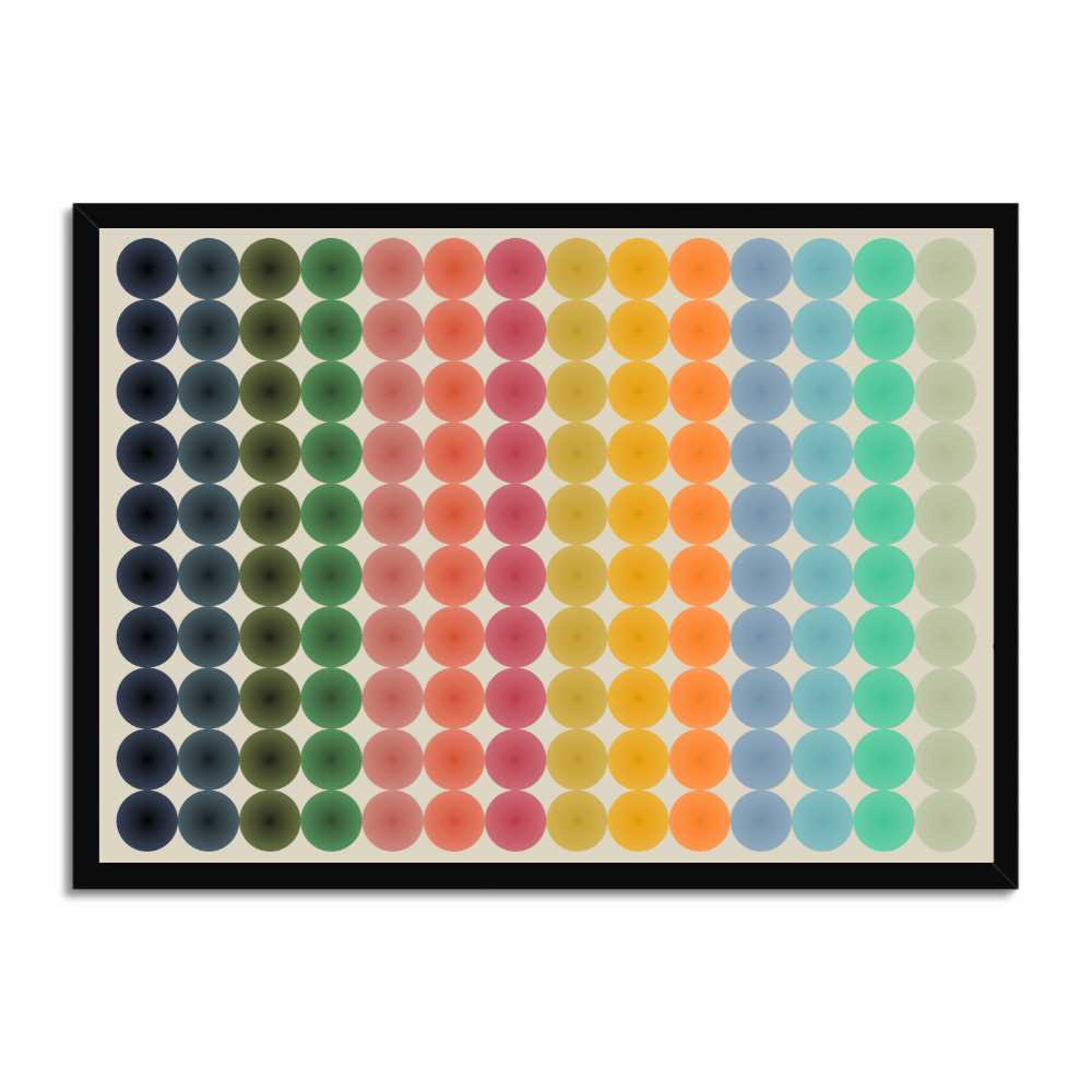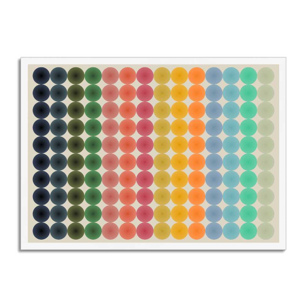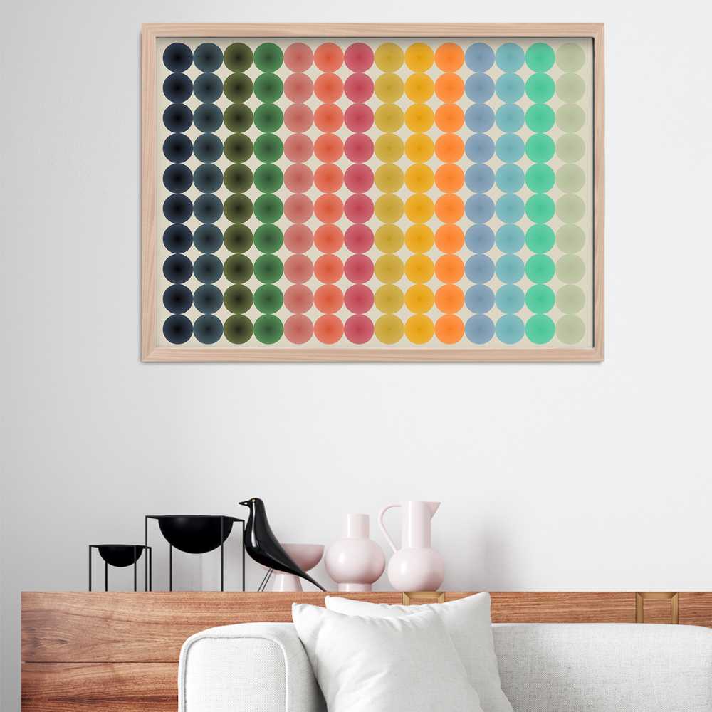 A modern abstract print that is a celebration of vibrant colour and form. This striking artwork features an array of multicoloured circles in spectrum of dynamic dance of hues and shapes. Perfect for those who appreciate bold, contemporary art.