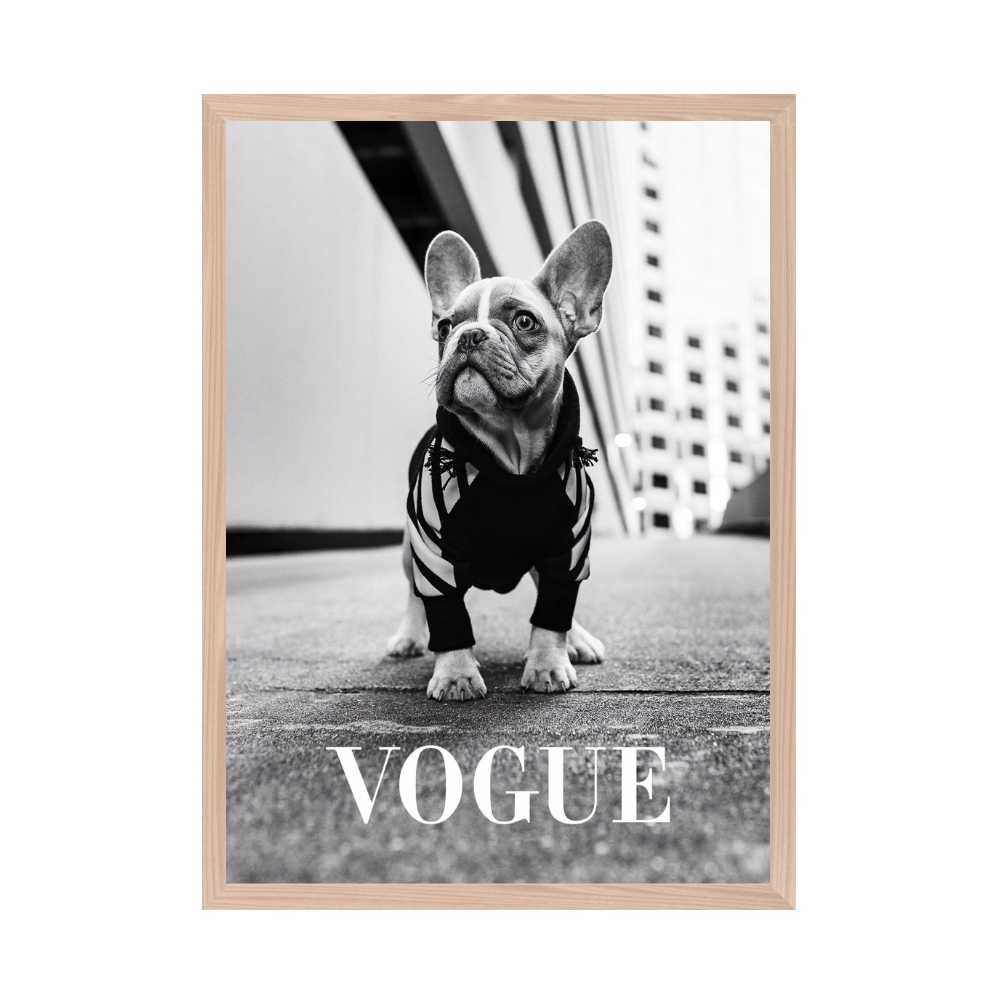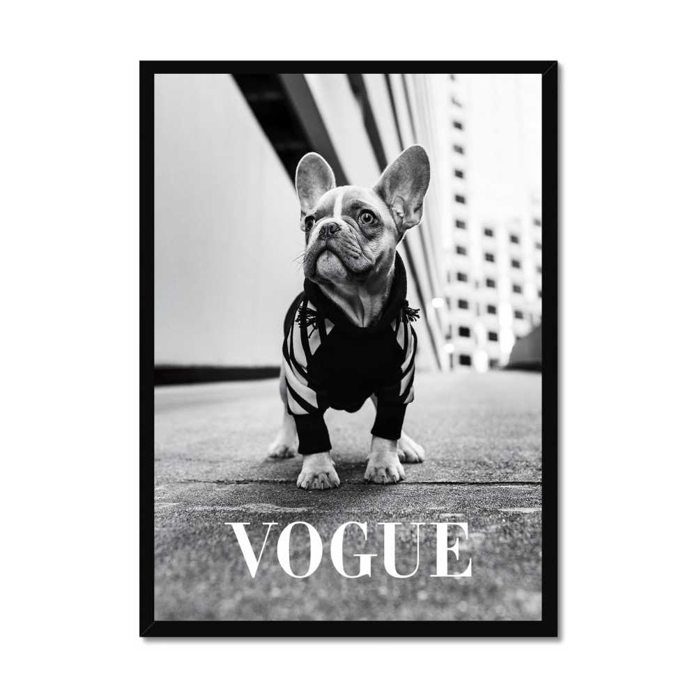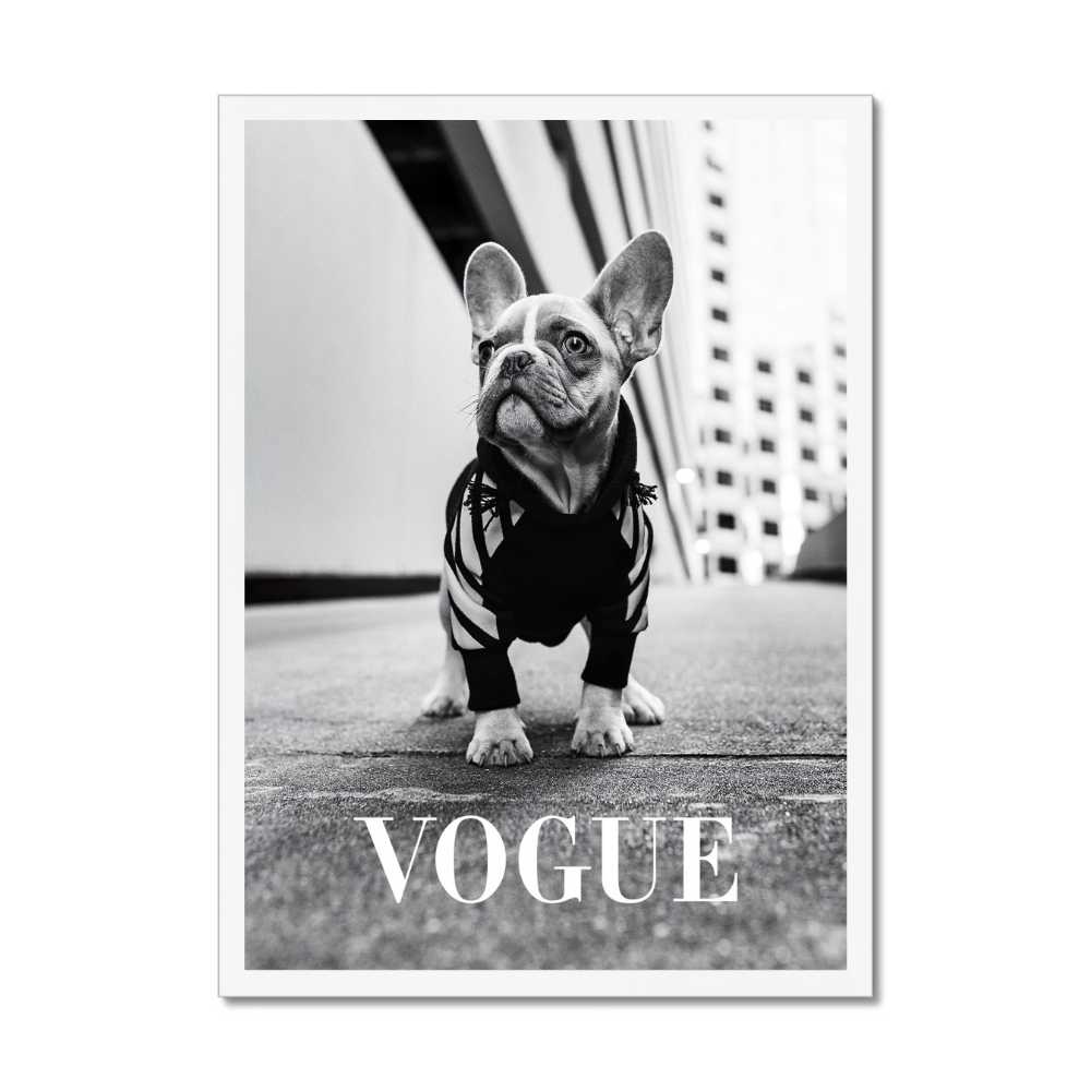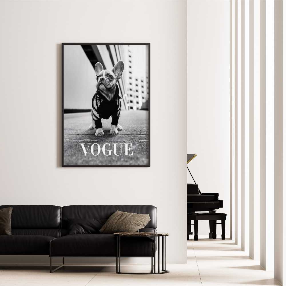Set in a monochromatic palette, this print captures the essence of classic fashion photography while adding a playful twist. The small dog, possibly an unwitting fashion icon, stands in stark contrast to the urban landscape, drawing the viewer's attention and sparking imagination about the story behind the image. The inclusion of the Vogue brand adds a layer of sophistication and allure, invoking the magazine's long-standing association with style, elegance, and the avant-garde.