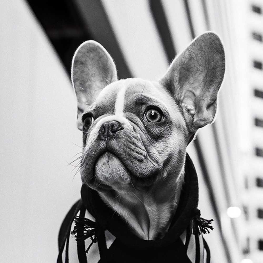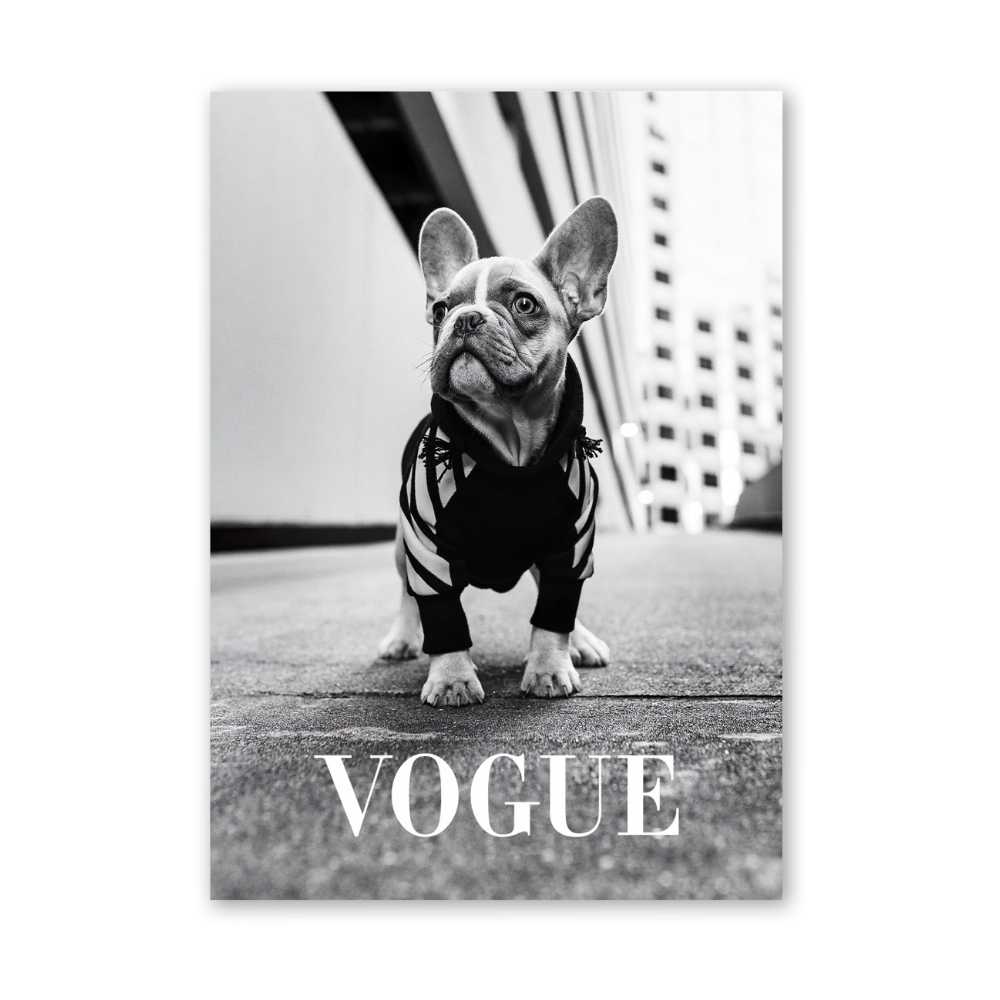 This unique piece of photography showcases a small, poised dog, exuding confidence and style against the backdrop of a city environment, all under the illustrious banner of the Vogue brand.