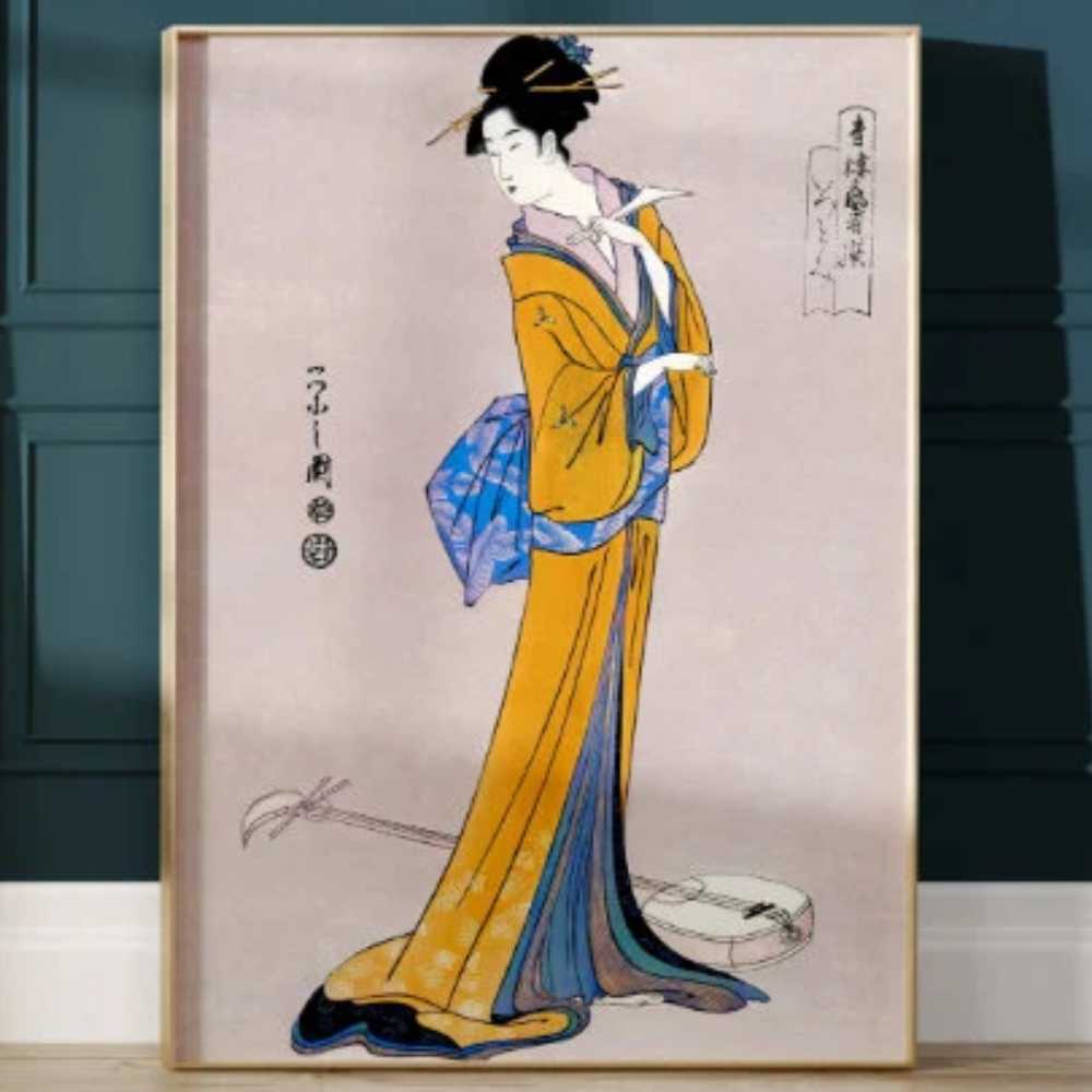 This wall art print showcases Itsutomi Abstract, a striking and elegant piece by Eishi Hosoda, a renowned Japanese artist noted for his exquisite ukiyo-e woodblock prints. Hosoda's work, particularly in this piece, beautifully illustrates the grace and refinement of traditional Japanese art, while also incorporating a unique abstract style.