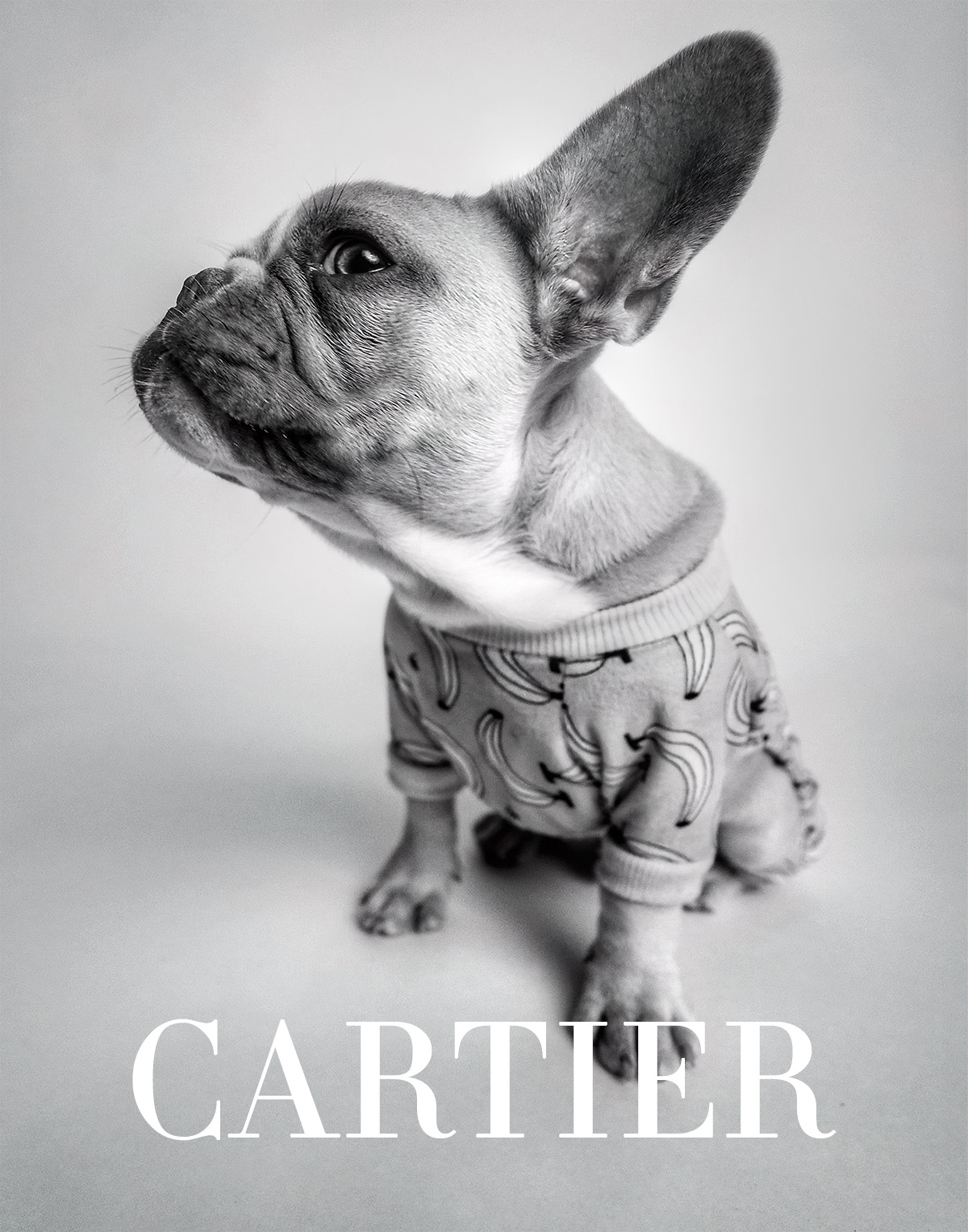 This unique piece of photography showcases a small, poised dog, exuding confidence and style against the backdrop of a photographer's studio set, all under the illustrious banner of the Cartier brand.