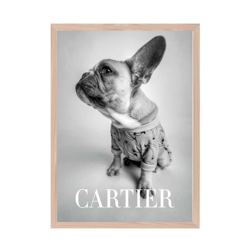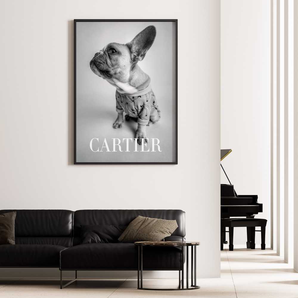 Set in a monochromatic palette, this print captures the essence of classic fashion photography while adding a playful twist. The small dog, possibly an unwitting fashion icon, drawing the viewer's attention and sparking imagination about the story behind the image. The inclusion of the Cartier brand adds a layer of sophistication and allure, invoking this fashion icon's long-standing association with style, elegance, and the avant-garde.