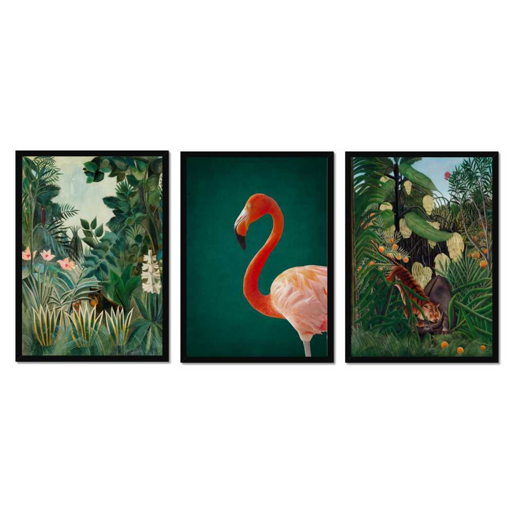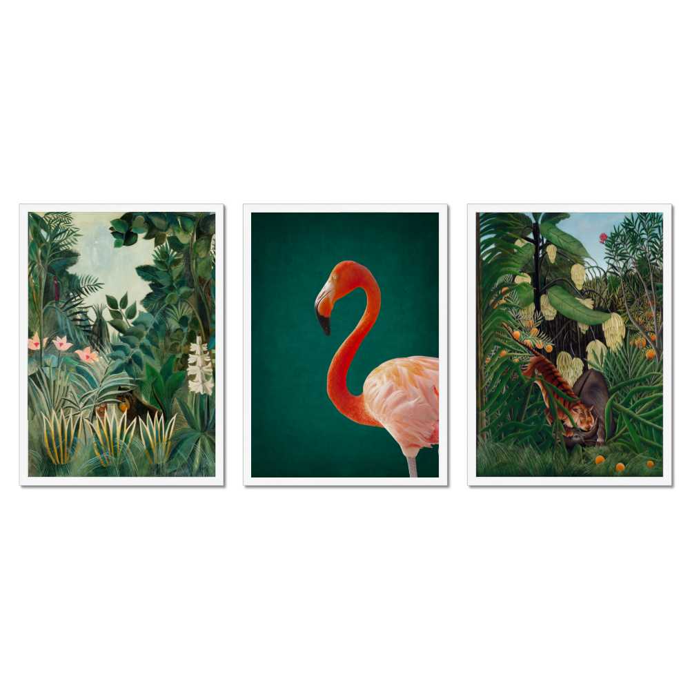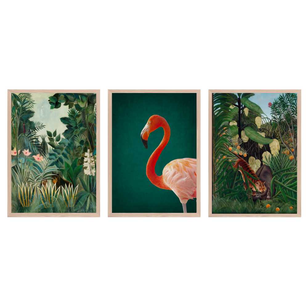 Step into the lush depths of the Equatorial Jungle with this captivating gallery wall set, featuring a set of 3 prints that blend the mesmerising allure of Henri Rousseau's iconic jungle scenes with contemporary botanical flair.