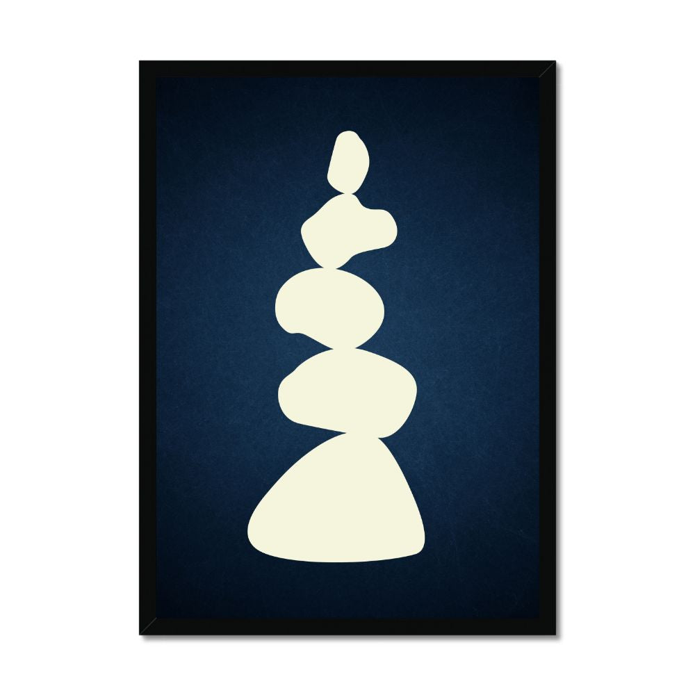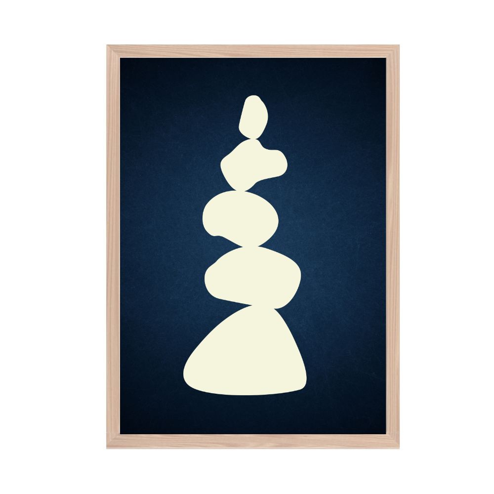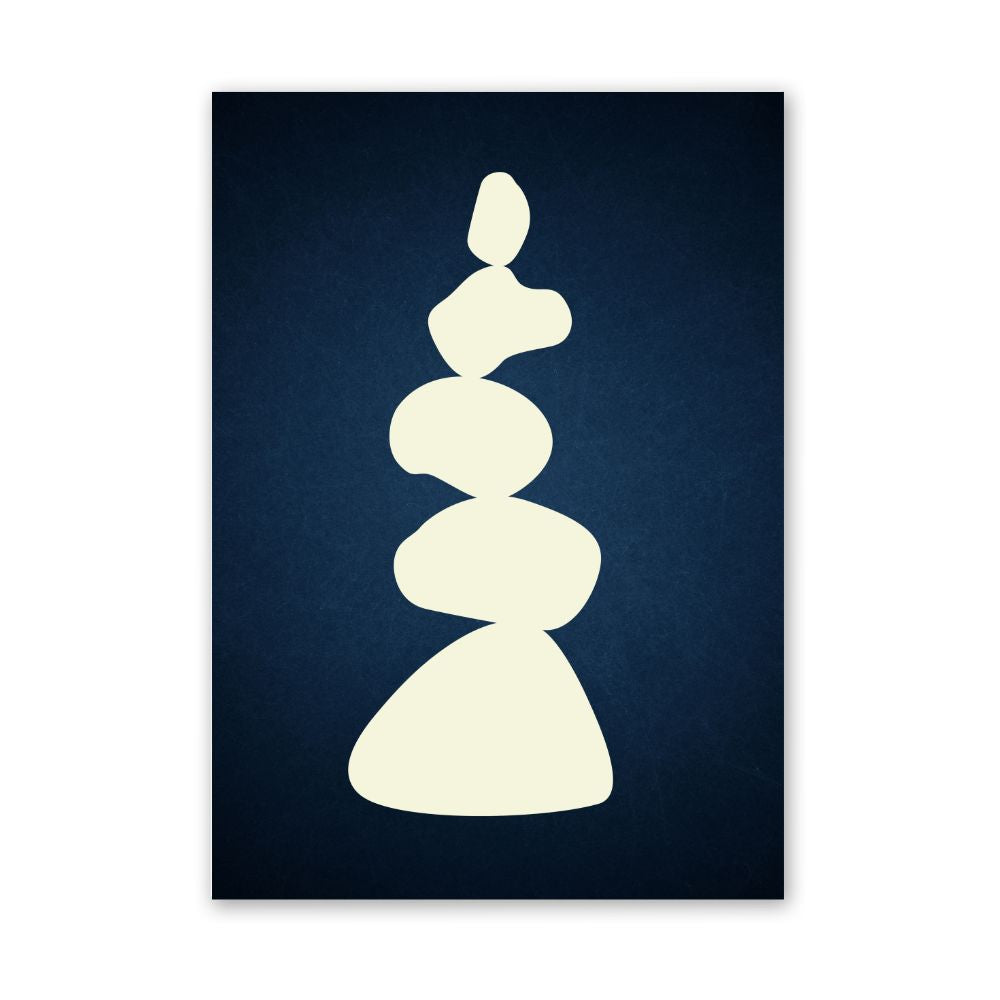 A captivating wall art abstract illustration that portrays the tranquil art of stone stacking. This piece features elegantly arranged cream-coloured rocks, each with its unique shape, set against a soothing blue canvas. Perfect for those who appreciate the beauty of simplicity and seek a sense of peace in their surroundings, this wall art print brings the meditative quality of nature into your space.
