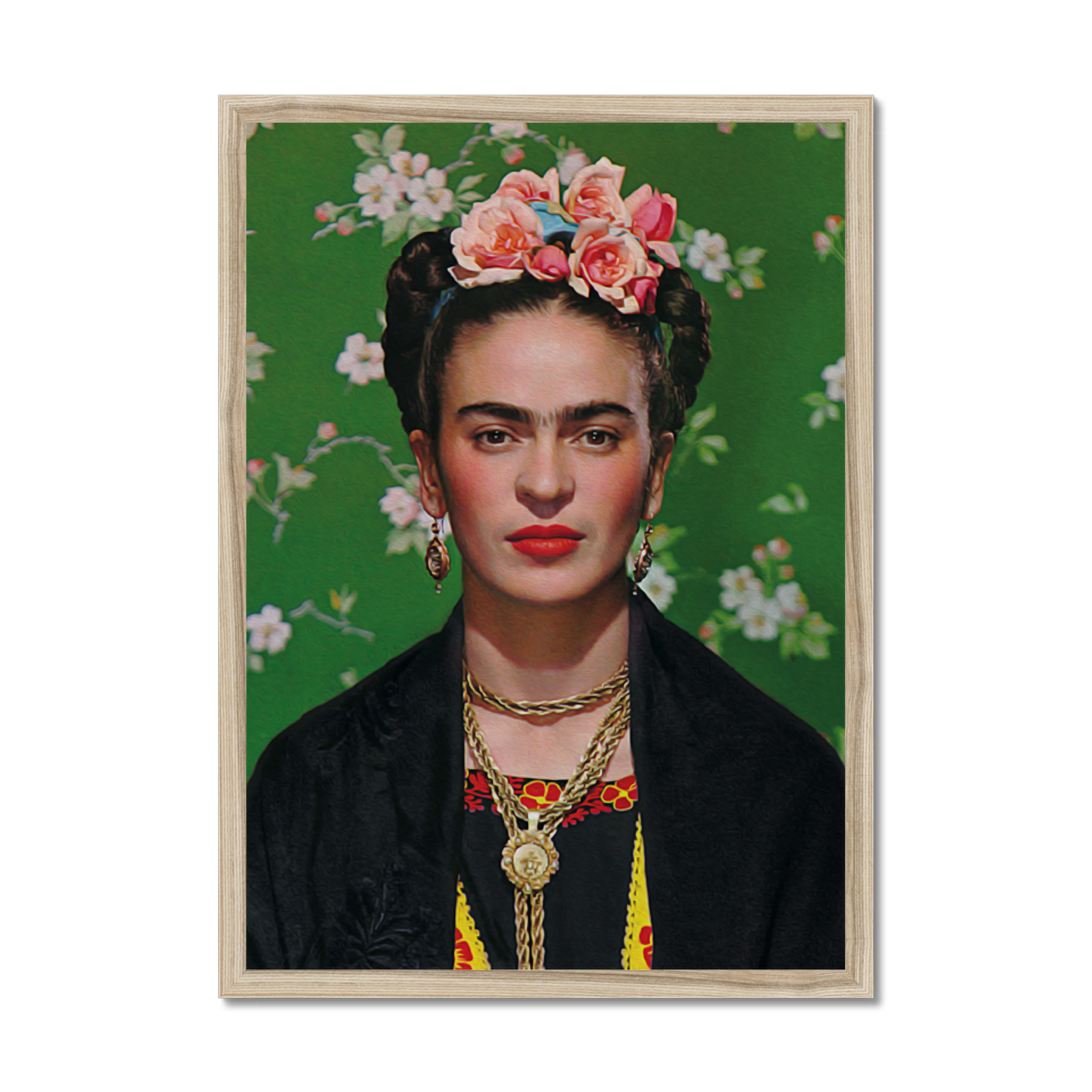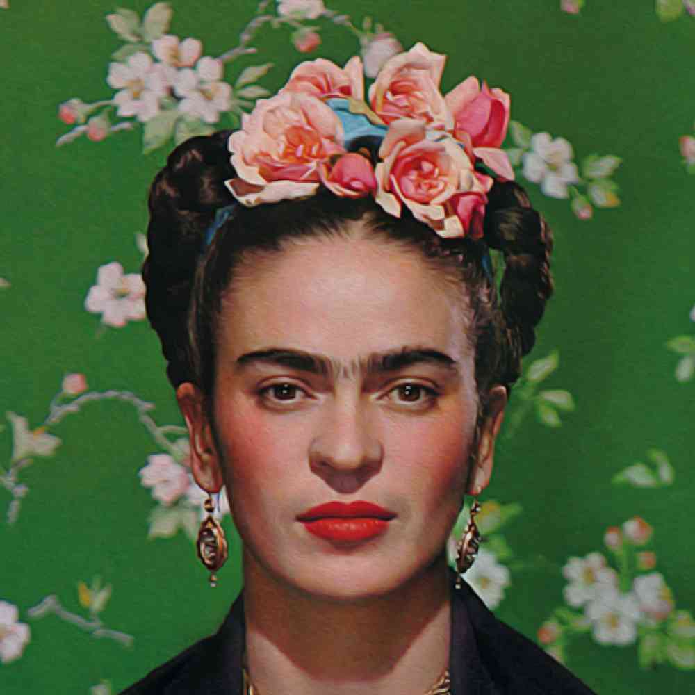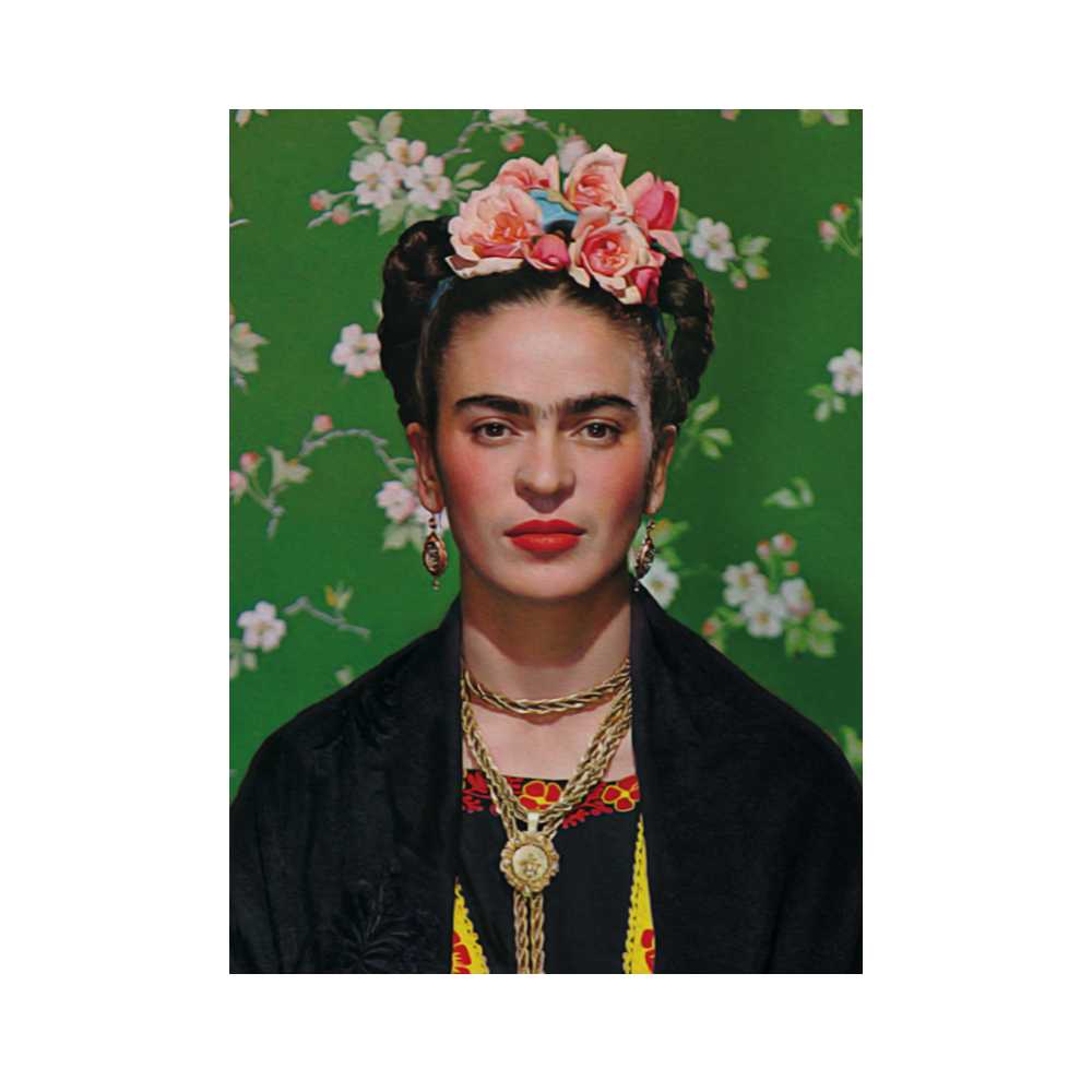 This wall art print features a striking portrayal of Frida Kahlo, one of the most iconic and influential artists of the 20th century, set against a backdrop of vivid and enchanting flowers on a green canvas. The artwork captures the essence of Kahlo's unique style and her deep connection with nature.