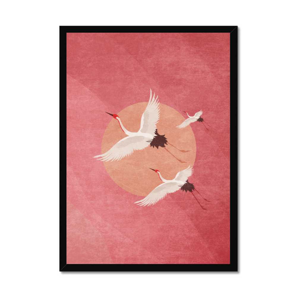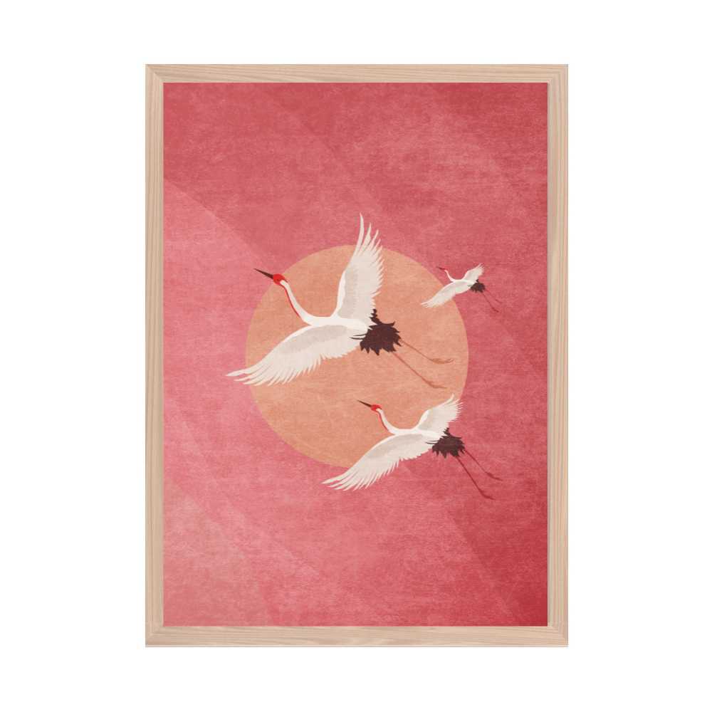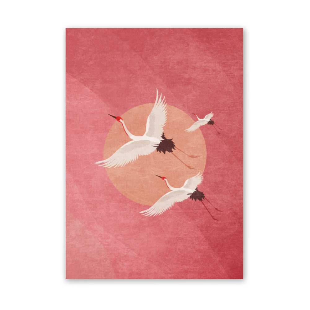 piece of wall art that captures the serene beauty and symbolic grace of three Japanese cranes in flight across an abstract representation of the rising sun. Set against a delicate pink background, this artwork merges traditional Japanese symbolism with contemporary abstract art to create a scene that is both tranquil and invigorating.