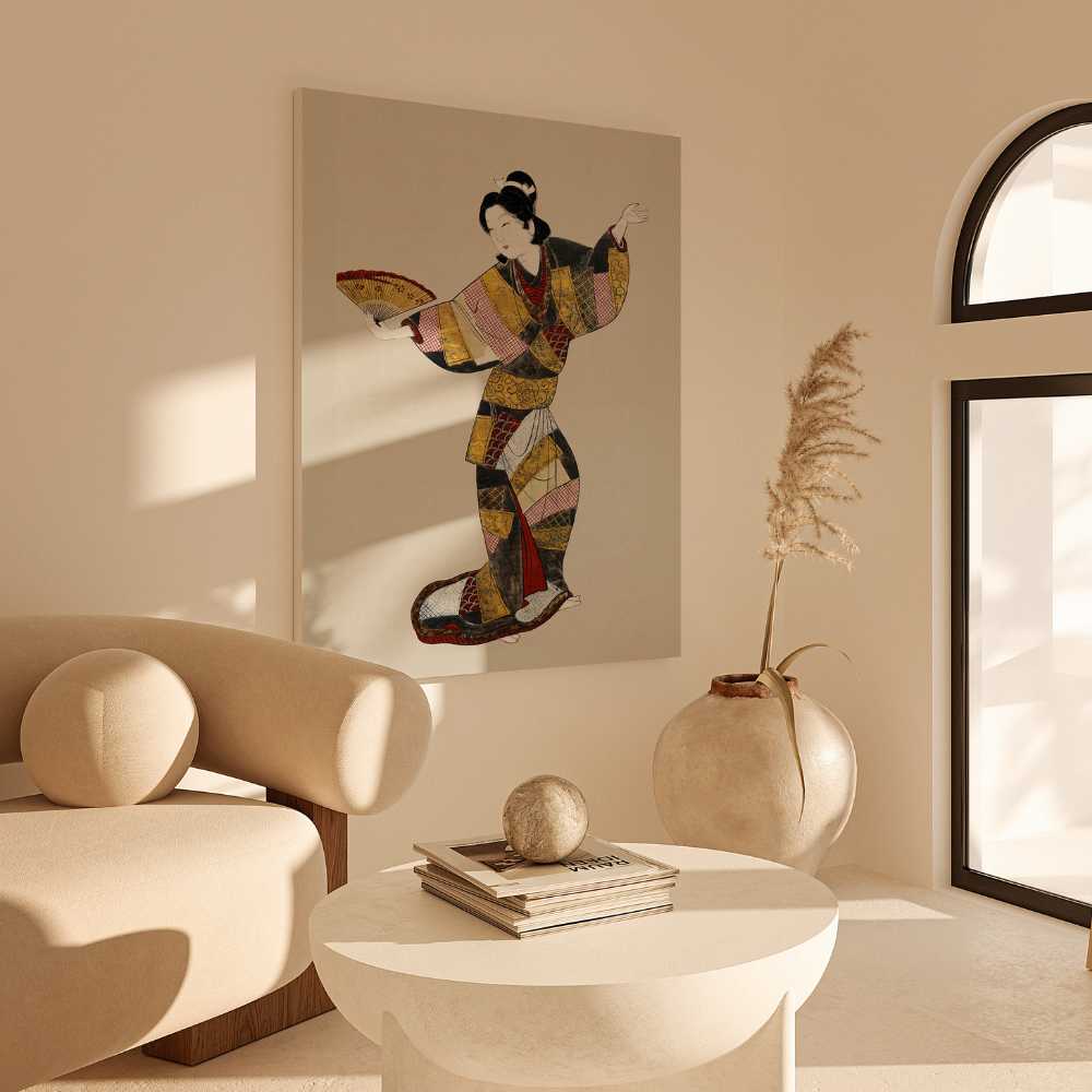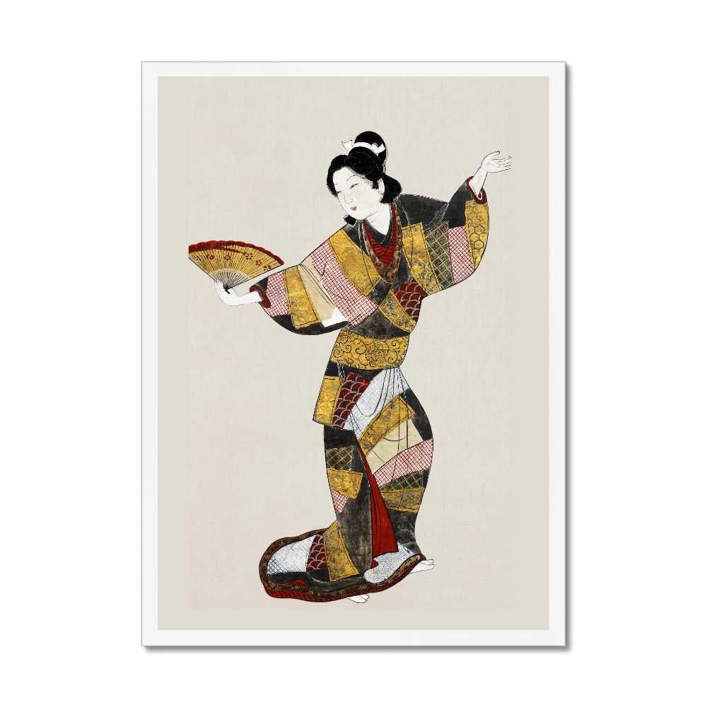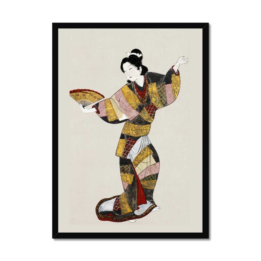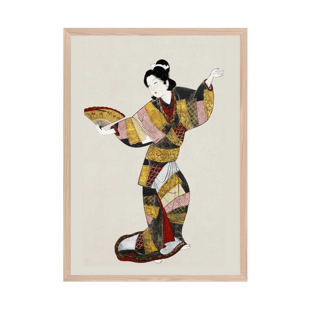 This wall art print is a reproduction of a vintage painting from the 17th century, depicting a Japanese female dancer. The artwork offers a fascinating glimpse into the cultural and artistic traditions of Japan during this period, showcasing the elegance and grace that characterise classical Japanese dance.