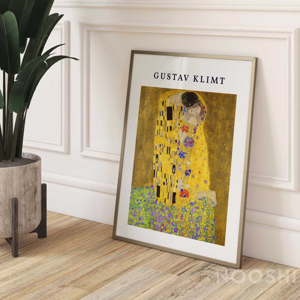This wall art print features "The Kiss," a renowned and iconic masterpiece by Gustav Klimt. "The Kiss" portrays an intimate moment between a couple, wrapped in a tight embrace, set against a shimmering, gold background.